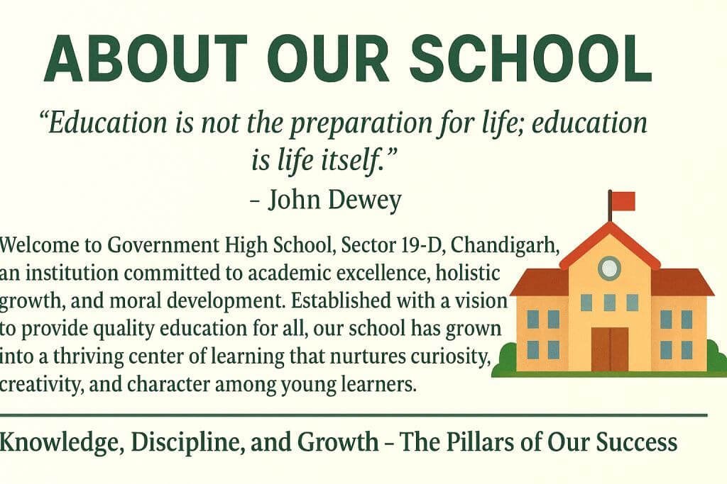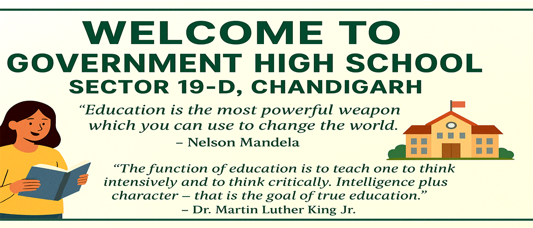 Welcome to Government High School, Sector 19-D, Chandigarh, an institution committed to academic excellence, holistic growth, and moral development. Established with a vision to provide quality education for all, our school has grown into a thriving center of learning that nurtures curiosity, creativity, and character among young learners. As a proud part of the Chandigarh Administration’s Department of Education, our school strives to build a community of learners who are disciplined, responsible, and inspired to contribute positively to society.
